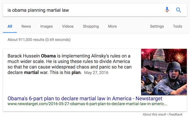 Google en nep-nieuwsDe afgelopen tijd heeft Facebook veel onder vuur gelegen voor het verspreiden van nep-nieuws, vooral gebruikers in de VS kunnen daar makkelijk meerdere links voorgeschoteld krijgen die in Macedonië tegen betaling door iemand daar uit de duim gezogen zijn. Maar Google kan er dus ook wat van, kennelijk zijn er geen mensen die bij gevoelige zoekopdrachten nakijken wat de resultaten zijn, terwijl de Kunstmatige Intelligentie hier duidelijk faalt.