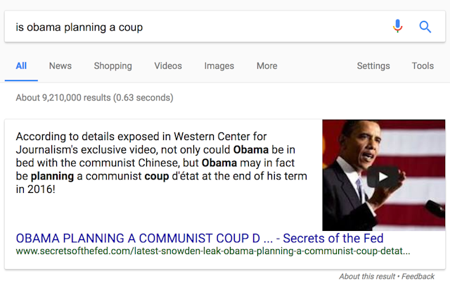Google presenteert dus als het 'enige juiste antwoord' dat meerder presidenten van de VS lid zijn geweest van de Ku Klux Klan en dat Barack Obama zowel de staat van beleg als een coup aan het voorbereiden zou zijn.