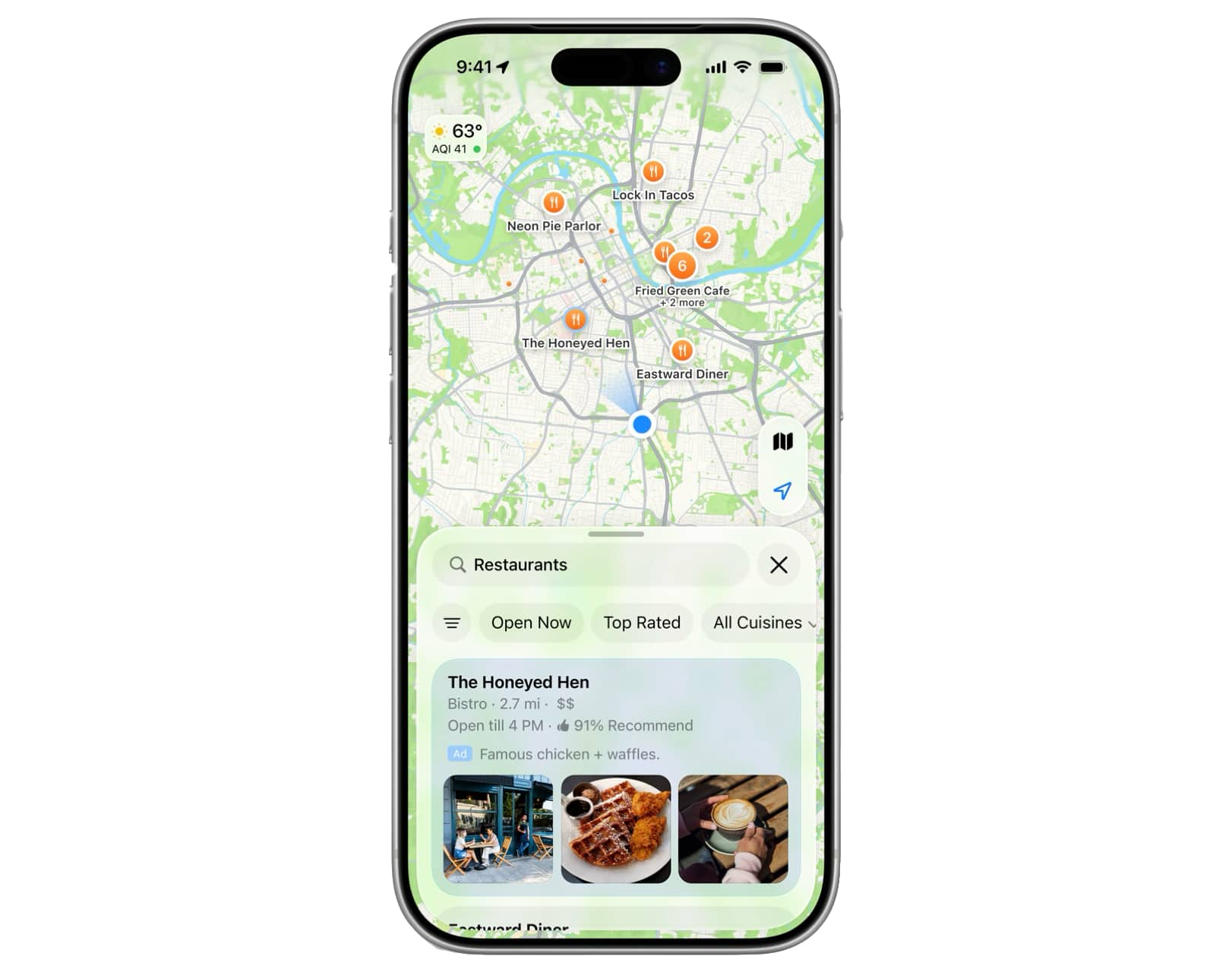 de eerdere aangekondigde commerciële plaatsingen (en dus ook advertenties) in Apple’s eigen Kaarten-app verschijnen.