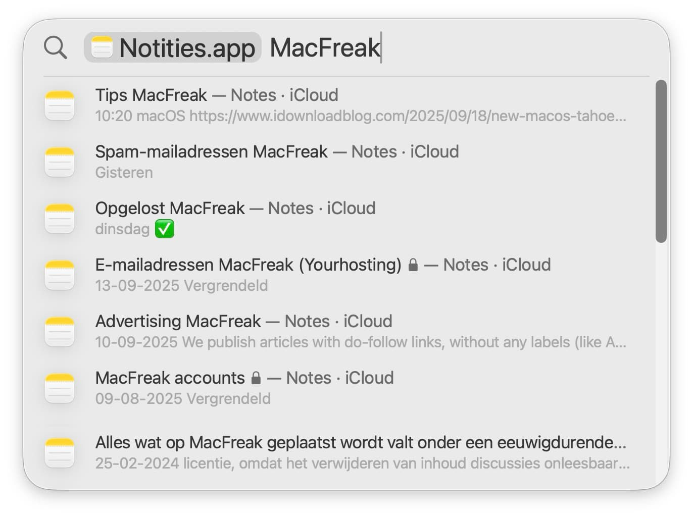 Is Notities.app eenmaal geselecteerd dan tik je op de Tab-toets, en voer je jouw zoekterm in. In dit geval is dat 'MacFreak', en hierboven zie je ook de resultaten. En dat is alles, je hoeft op deze manier dus niet meer eerst de app zelf te openen en daar je zoekterm in te voeren.