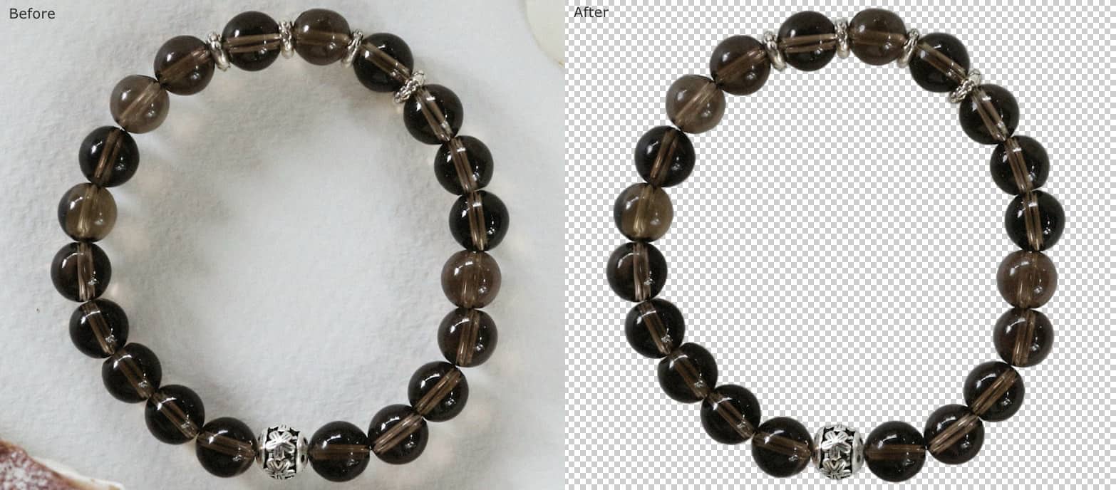 3. Sieradenfotografie: omgaan met transparantie en reflectiesSieraden vormen vaak een bijzondere uitdaging bij het verwijderen van achtergronden, vanwege halftransparante edelstenen, complexe openingen tussen kralen en sterk reflecterende oppervlakken.
