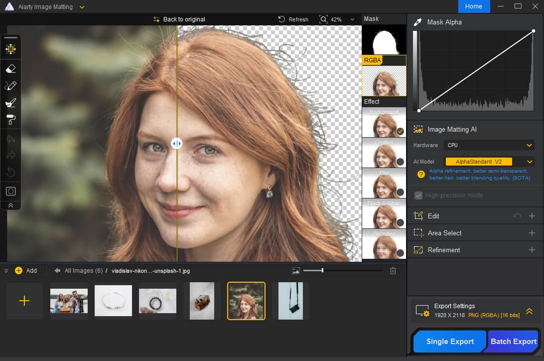Belangrijkste functies van Aiarty Image MattingAiarty Image Matting is ontwikkeld voor snelle en nauwkeurige achtergrondverwijdering en biedt tegelijkertijd een complete workflow voor beeldverwerking - alles in een eenvoudige, gebruiksvriendelijke interface die ook geschikt is voor beginners.