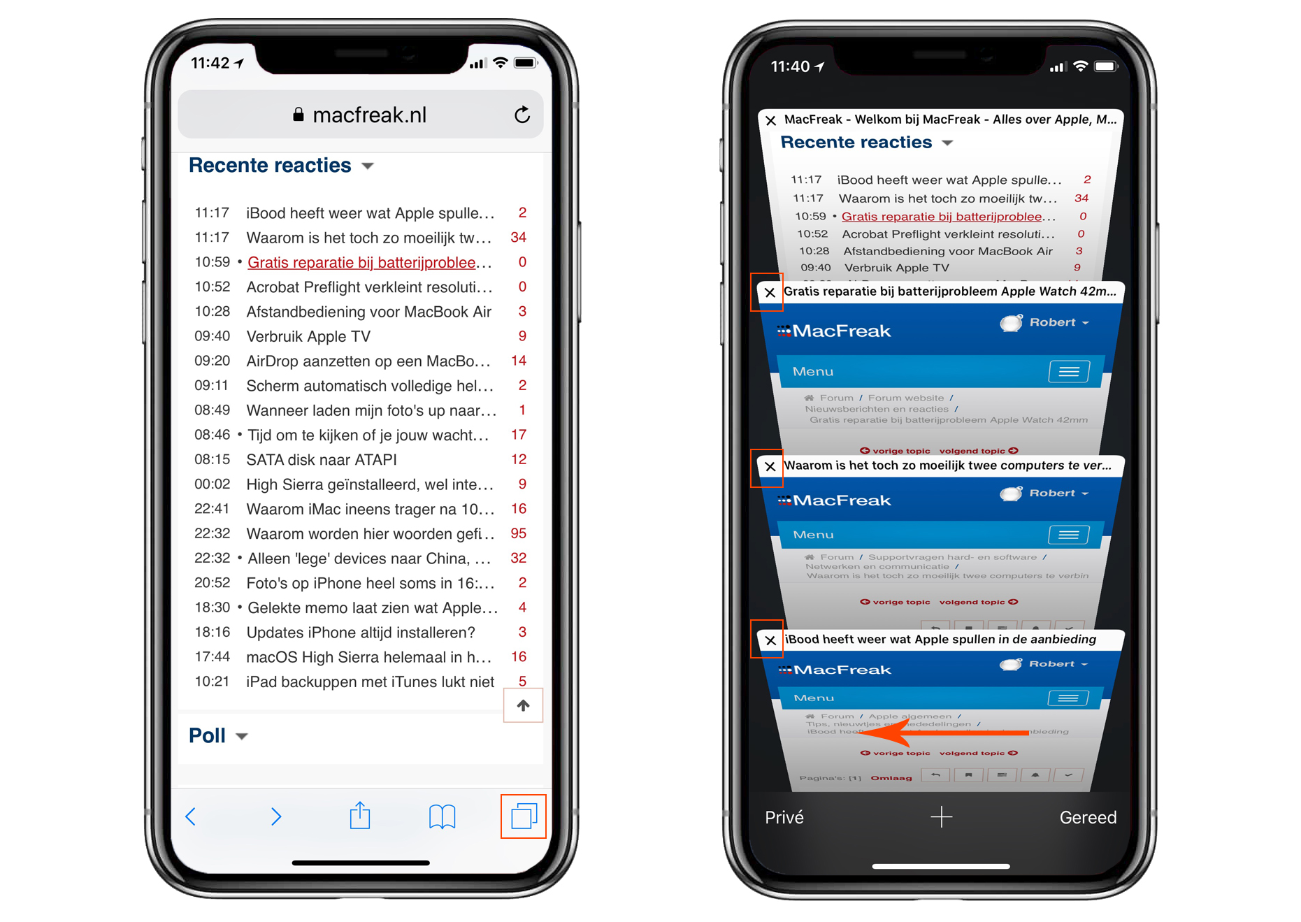 Als je daar eenmaal bent ga je niet op de kruisjes tikken, dat is allemaal veel te veel gefriemel. Daarvoor veeg je met je vinger van rechts naar links, en sluit je zo razendsnel alle tabs die je niet meer open wilt houden (in de afbeelding hieronder in het rechts, als pijl weergegeven).
